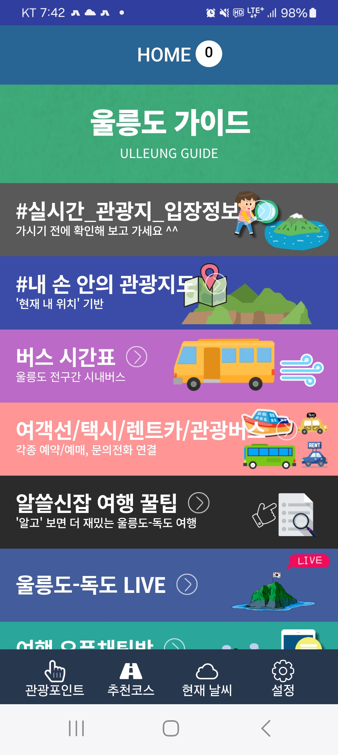 많은 분들이 알고 계시겠지만 울릉도 여행시 유용한 어플이 있다.바로 "울릉도가이드"울릉도 관광지도는 기본이고 주요관광지 정보와 교통 숙박 식당 등등 거의 모든 것이 망라되어 있다.메인화면.. 보면 바로 알 수 있음지도를 보고 주요관광지를 클릭하면 바로 설명이 주루룩~~여러곳을 라이브영상으로 볼 수 있음도동항 모습..그외도 유용한 정보가 가득..#광복80주년 #독도가대한민국이다 #울릉도 #독도 #에메랄드울릉 #세계10대명품섬 #포항에서울릉까지2시간50분 #서울에서아침먹고울릉에서점심먹고 #울릉도엔뱀이없다 #세계에서제일빠르고편안한엘도라도익스프레스 #서울에서포항역까지고속철도는2시간20분대 #광주에서도3시간반이면충분 #아침9시50분포항출발12시40분울릉도착 #울릉도수제맥주울릉브루어리 #울릉도렌트카 #자기차가져가면..